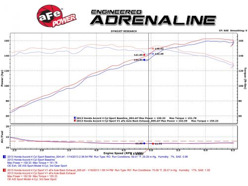aFe is proud to introduce the new Takeda Axle Back Exhaust System for the 2013-2014 Honda Accord Sport Sedan L4-2.4L. In recent testing this system produced 7 horsepower and 7 lbs. x ft. of torque. This exhaust starts out with an OE style flange and uses 2.25" tubing that merges into dual 1.75" tubing which improves performance across the power band while maintaining a great tone. TIG-welded and brushed finish mandrel bent 304 stainless steel for maximum strength and durability, this system is equipped with dual high flow, polished mufflers for maximum flow and performance. To finish off this exhaust are dual laser etched, double wall, angle cut 304 stainless steel tips. This exhaust uses all factory hanger locations for a hassle free installation. No modifications necessary.