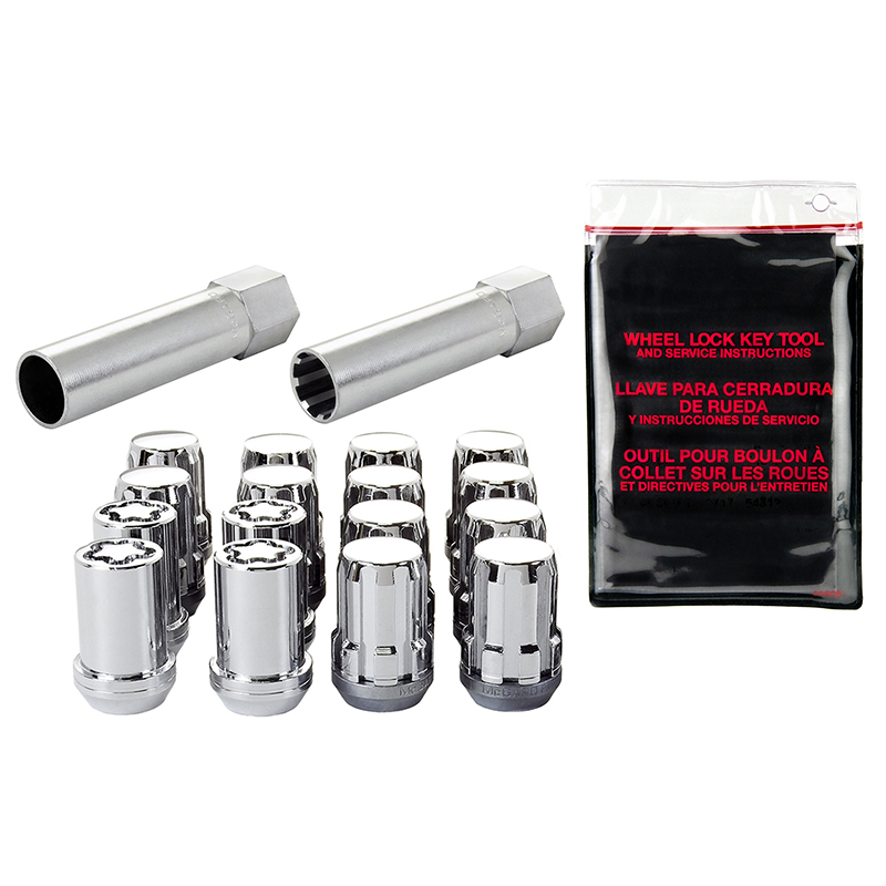 The convenient way to order Tuner wheel locks and lug nuts contains all the hardware that you need to install 4 wheels and tires. Why settle for ordinary lug nuts? SplineDrive Lug Nuts combine style and performance. A no-compromise design engineered to fit small diameter recesses in Tuner style wheels. SplineDrive lug nuts offer closed-end design, maximum gripping power, more stud engagement and a greater seating surface than socket style lug nuts. In addition they are 30% lighter in weight. Like all McGard lug nuts, the chrome plating is guaranteed for life not to rust, chip or peel. The easy-to-use, one-piece wheel locks function like regular lug nuts, but require a special key tool for installation and removal. The computer generated key designs allow for an infinite number of key patterns. McGard manufactures wheel locks and lug nuts in the USA to meet or exceed O.E.M. standards for safety and durability. Every lug nut and wheel lock is fully machined from restricted chemistry steel made specifically for McGard and through-hardened for its unsurpassed level of safety. This product may contain globally sourced materials/components.