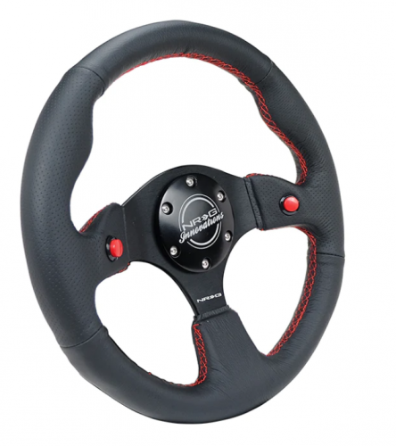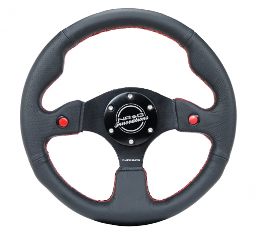 The RST-007S is wrapped in soft supple leather for that luxurious look inside your car. The Dual Button is ergonomically designed within your thumbs reach for easy access. The sporty three spoke black finish center is accented with an elegant chrome centerpiece. The red stitching makes the Two button Series stand out from the cockpit.These units provide the best in both quality and performance.