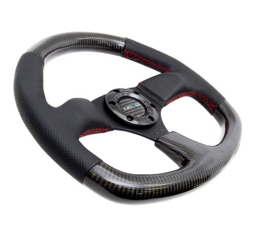 The ST-009CF Series steering wheel is the perfect choice for that sporty look inside the cockpit. It features a flat bottom to increase the space between driver and steering wheel for a more comfortable driving. Constructed from real Carbon Fiber and luxurious soft supple leather with Red Stitching and top of the line materials. These 3 spoke units resemble the Formula 1 D-shaped style wheel to provide the best in both quality and performance. NRG steering wheels are sure to give your vehicle that extra edge of control and styling.
