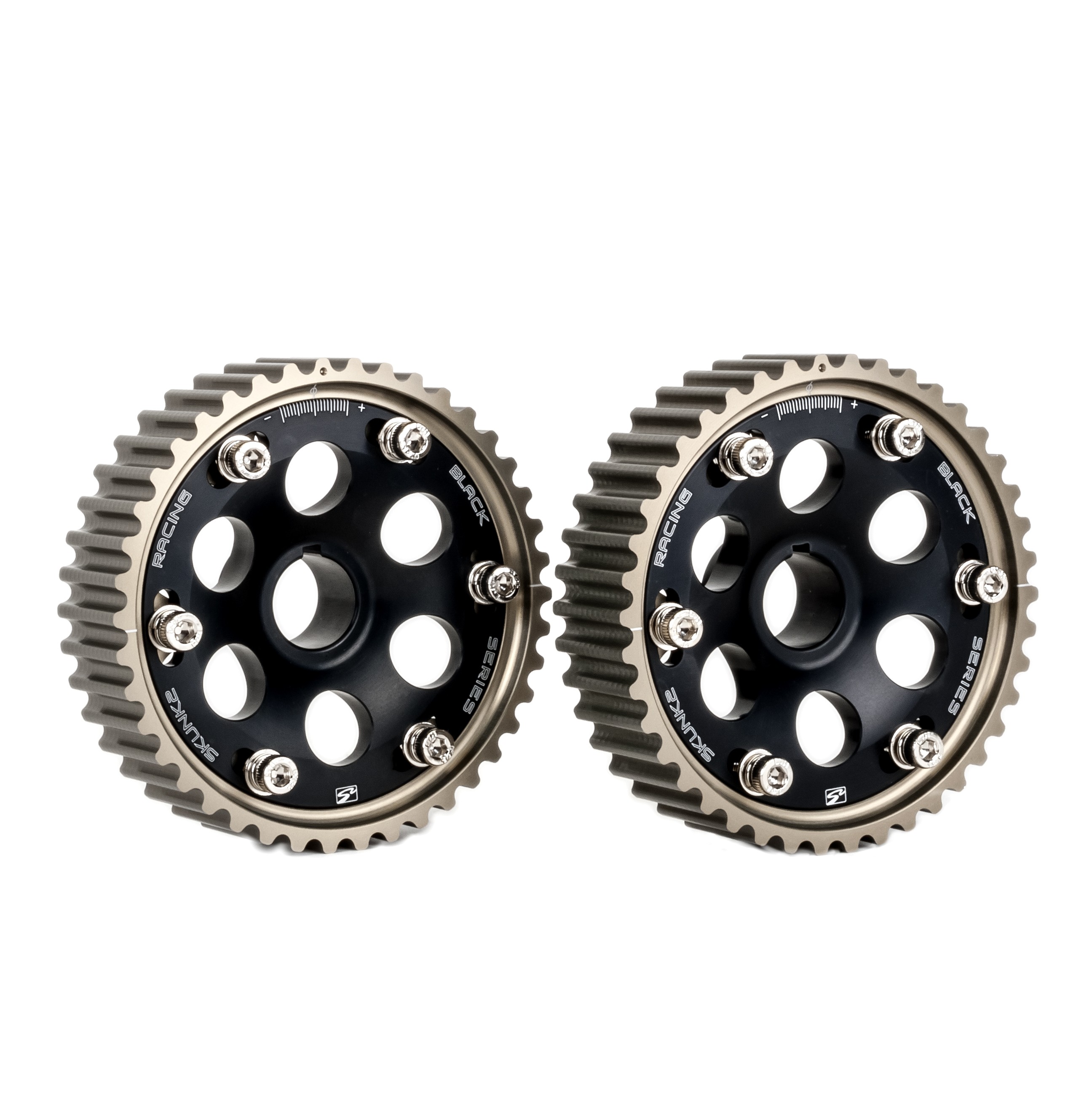 An engines camshafts must be set at their proper positions relative to the crankshaft in order to maximize horsepower. Pro Series Cam Gears for Honda's H-series & F-Series VTEC engines enable serious tuners to optimize horsepower and torque by being able to adjust camshaft timing +/- 10 degrees, in one-degree increments, allowing them to tailor the power curve appropriately. Thanks to laser-etched timing and directional marks, precise camshaft adjustments can be made quickly and easily. Pro Series Cam Gears feature precision-machined, hard-anodized teeth to reduce premature wear with a signature, six-bolt design that eliminates gear slipping. Skunk2s lightweight design (35 percent lighter than OEM) and CNC-machined, 7075-T6 billet aluminum construction reduces rotational inertia, resulting in increased engine response and acceleration. Skunk2s adjustable cam gears have also been proven on race cars in the most extreme conditions for more than a decade.