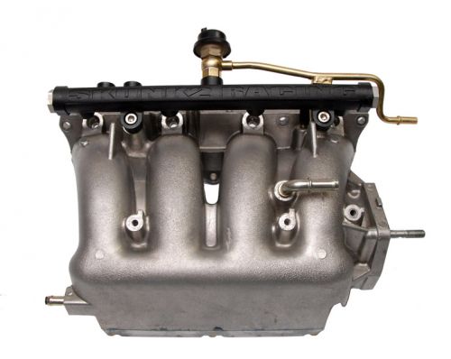Skunk2 introduces its new series of composite intake manifolds and fuel rails. Skunk2's new composite components are made using a proprietary casting process, from a carbon reinforced aerospace thermo-polymer composite that is 33% lighter, 60% stronger, and runs up to 100°F cooler than aluminum. Keeping the air and fuel cooler results in a significant increase in horsepower and torque. This composite is also chemical resistant to all types of fuels including alcohol.