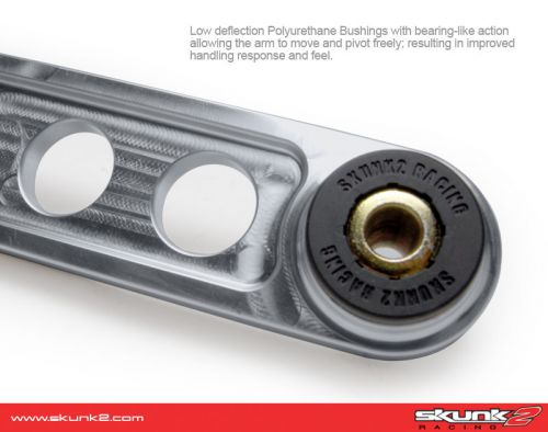 These lower control arms are forged aircraft quality AL2024 billet aluminum and are CNC machined. Skunk2's LCAs feature steel mounting plates to equally distribute the clamp loads for a more durable and secure connection and feature low deflection polyurethane bushings (many competitor's LCAs are tightened directly to the aluminum and have a tendency to over stress the material and loosen over time).