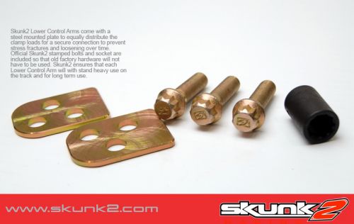 All Skunk2 Lower Control Arms for the EP3, DC5, EM/ES Civic, and Element include special new Skunk2 bolts and sockets required for installation. Skunk2 Lower Control Arms are available in a Clear Anodized Finish. JDM Gold and Hard Finish will be available soon. Many hours of research and development has gone into the Skunk2 Lower Control Arm for superior quality and maximum performance.