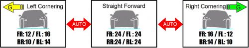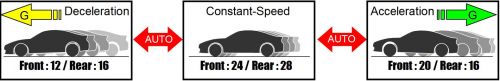 Lateral G-Actuated Automatic Adjustment Mode This mode enables automatic adjustment according to the changes in lateral (cornering) G-force. 2 separate modes available; "G-Arrange Mode" to adjust damping force when G-force reaches the preset value (max 10 memories) each time, and "G-Linear Mode" to adjust linearly according to the preset G-force values, automatically supplementing the values in between.