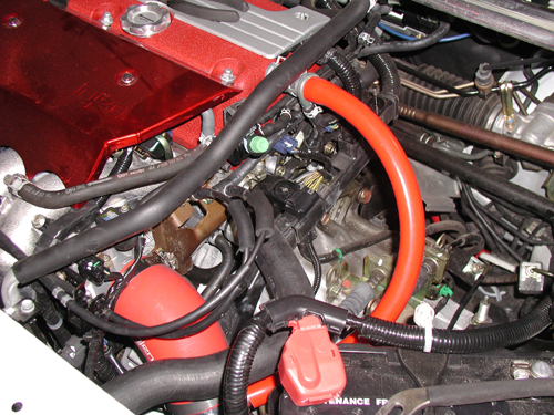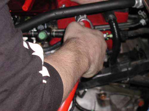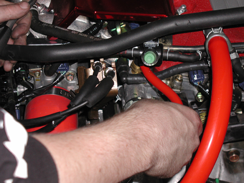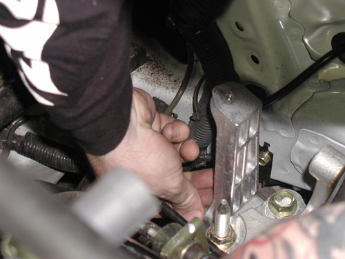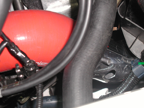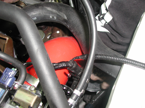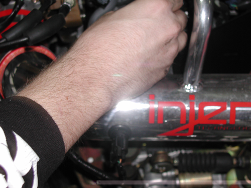 Install the flexable intake arm onto the intake and feed the intake up and through to the throttle body. Make sure you are in 5th gear to make sure you have enough clearence between the intake and the transmisson.