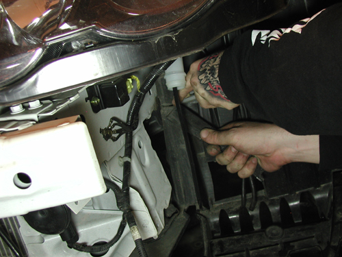 Remove the two pumps and the three grommets from the stock washer bottle. Install the pumps and grommets onto the new Injen washer bottle. Install the bottle using the two screws and rubber bolt.