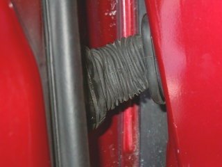 d. Remove the rubber feeder grommet from the door and a couple of the wire holder clips. This will allow you to get enough slack to undo the tape from this end of the rubber feeder grommet.