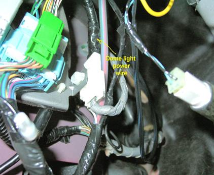 Remove connector pins 10 and 11, a light green (passenger side) and green (driver side) wires from the white connector. These are the door switch circuits. These connect to ground when the door is opened. In the picture to the right, the wires from the lamp socket are the red and green wires.