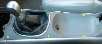 Using a small flat bladed screwdriver wrapped with tape to help prevent marring, pry off the top portion of the console. The pictures below show the approximate location of the plastic clips (yellow).
