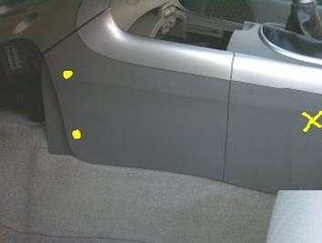 Free the sides of the console by, removing the retainers in the area (on the inside) marked "X" (access these from the top), and then the side retainers by pulling gently in the areas of the yellow dots.