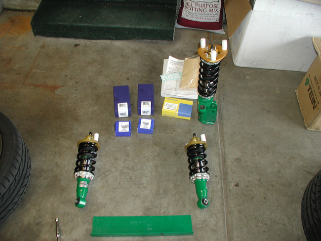 Make sure all nuts and bolts are tightened down and roll the car off the lift or the jack stands. Drive up for a short distance, often hitting the brakes hard to get the springs to set a little bit. Check clearance at the front and the rear to make sure they are equal and you are not going to scrap anything. Get an alignment as soon as you can so you don't ruin your tires. Since the Tein are 24 way adjustable, make sure you also play with the adjustment for ride quality.