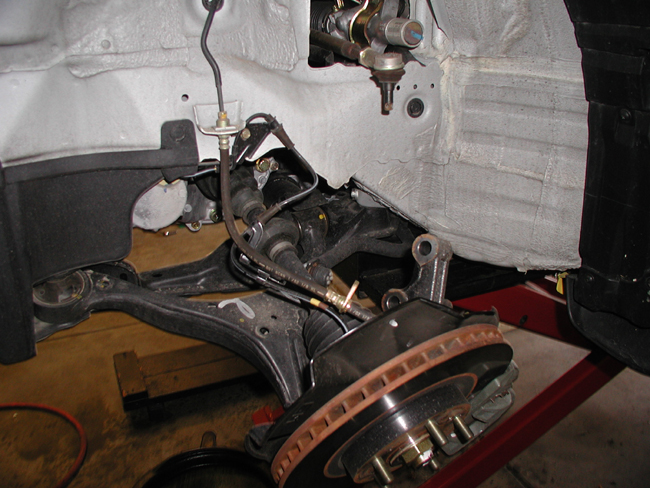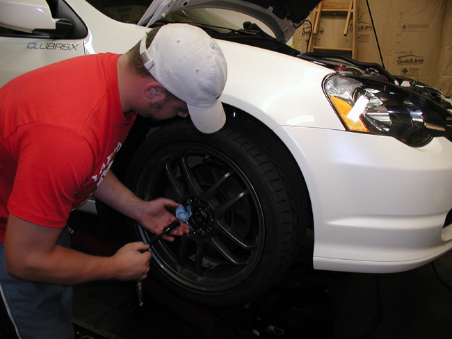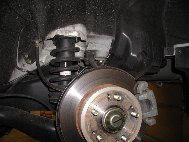 Because of the limited travel of the spring, we had to install the front wheels and slowly lower the car in order to get the strut to mount correctly, using the ground as a third person. This is were two people are needed in order to get the top bolts to line up correctly. Once each side is installed and all three bolts are sticking out evenly, reinstall the three top nuts on each side (this is why you needed them close to you). Make sure the nuts are tight before moving on.