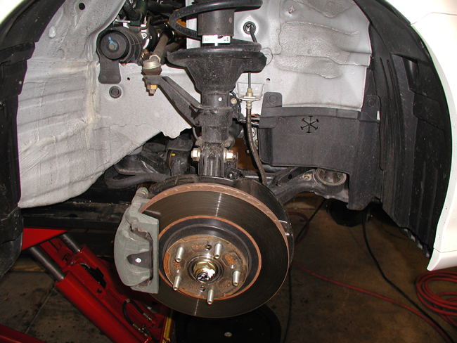 Remove front wheels and the three nuts that are on top of the front struts. Keep them close by, you will need immediate access to them later on.