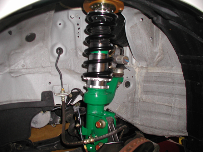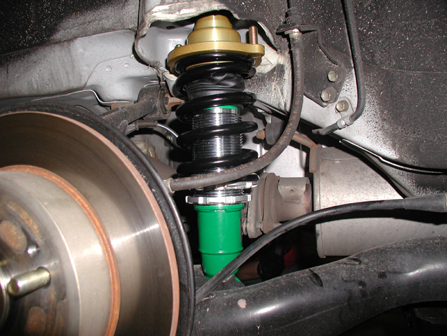 Install the rear camber kit and reattach the three bolts on each side that hold them on. Put together the Tein coilovers follow the instructions. Make sure to measure the distance between the bottom of the spring and the bottom of the shock. Making sure these are equal on both sides and to the front struts will really help in getting the height adjustment correct later on. Install the wheels and use the ground as a third person to get the shock to mount correctly (as you did for the front). This again is were you need someone sitting in the car to make sure that each side lines up correctly. As soon as the bolts are in the holes, reinstall the nuts and tighten them down.