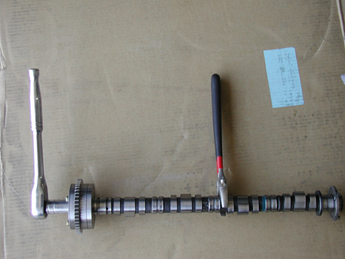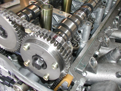 Do not do this step on concrete or a really hard surface, you could damage the camshafts. Using a 17mm socket (intake) or 14mm socket (exhaust) and adjustable wrench, remove the cam gear from the camshaft. Install the gear onto the new camshaft putting some oil onto the threads of the bolts. Tighten the intake cam gear bolt to 83ft lbs and the exhaust cam gear bolt to 51ft lbs.