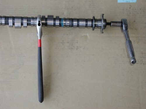 With the caps removed, lift up on the camshaft to help with the removal. You are going to slide the cam out through the chain. Be careful not to damage anything and take your time. It will take some time to get the cam gear and the chain apart. If you lift up on the camshaft it helps and as well as moving the cam gear toward the inside of the motor. Only replace one cam at a time, do not take them both out. Remove either the intake or the exhaust first and then reinstall before starting on the other one.