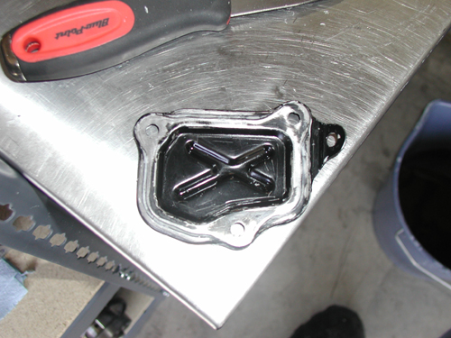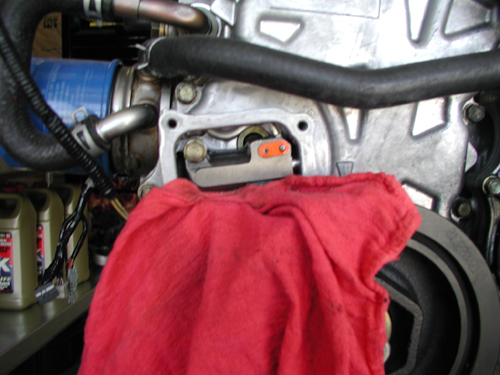 Remove the allen wrench from the tensioner and clean off the Hondabond around the opening using a sharp scraper. Take your time, you don't want any pieces falling into the oil pan. I recommend putting something in the hole to protect it while you are scraping the top and the sides.