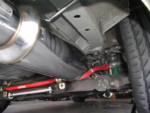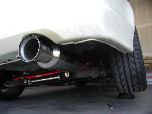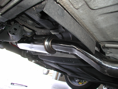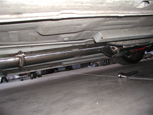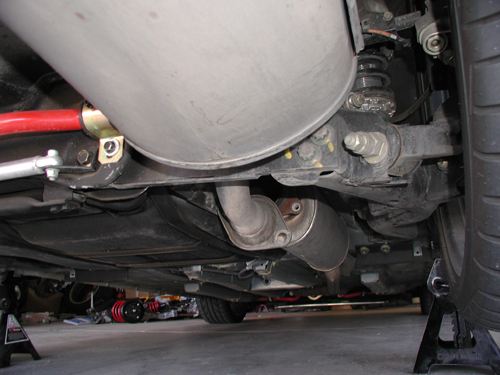 Raise up and support the car and start by removing the stock muffler. You do this by removing the two 12mm bolts right in front of the suspension. Save all rubber hangers.