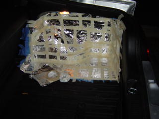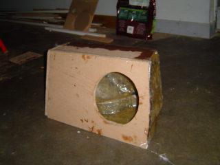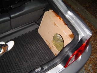 After I decided what size sub and what kind of enclosure I wanted to put in, I needed to figure the volume of the enclosure. Well this is a bit tricky if the shape of the box is contouring around wheel wells and the like. So here's the trick. I got a cardboard box the recommended size for the sub and filled it with styro foam popcorn. I placed the styro in a large garbage bag and conformed it to the spot in the trunk where the sub was to be. I eyeballed it and used masking tape to outline the border of the box. There is some tolerance in size & I'm no calculus buff so there it is.