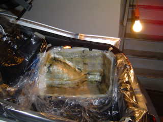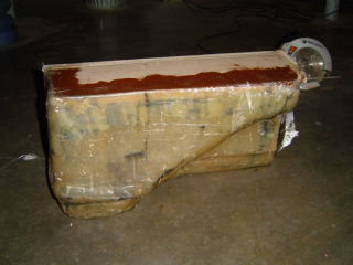 The pic shows the first layer of resin. You start by painting the resin on the tape layer immediately following with fiberglass material and then another layer of the resin. A note about the resin and hardener: definitely read the instructions about this. The more hardener you use the faster it sets and begins to the less you use the longer it will take. It takes a long damn time to set if you don't put enough in. There is a little trial and error involved. The colder it is the longer it takes to set up as well. I had never done this before so it was a little hit and miss. Another tip is that it seemed to work better to make stabs with the brush. Air bubbles are bad, you want to avoid them b/c they weaken the strength of the box.