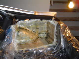 I draped plastic drop cloth over everything b/c the fbg resin is nasty stuff, very drippy and sticky. I took every precaution I could. I did the taping and foiling the day before the resin. You really want to do this on the weekend when you don't have to be any where real soon. You can't go driving around while the stuff sets up. The mix of hardener and resin I used in the first batch was conservative and took a while to set. After the first coat dries you can pop it out and do everything else outside the car.