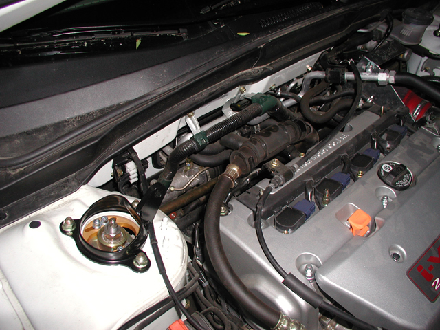 Remove the three 14mm bolts on the drivers side and install the strut bracket and tighten the bolts back down.