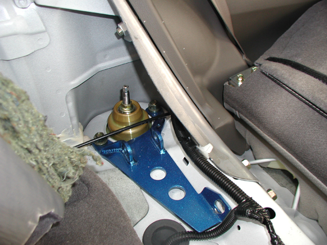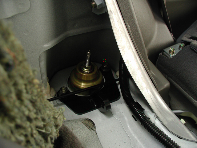 Attach the strut bar supports on both sides. Do not tighten down the bolts just lightly screw them on. Attach one side of the strut bar to the support to use a template. Now, cut out holes in the side carpet pieces where the strut bar will come through. Keep cutting until the bar can easily fit and mount properly on both sides through the carpet.