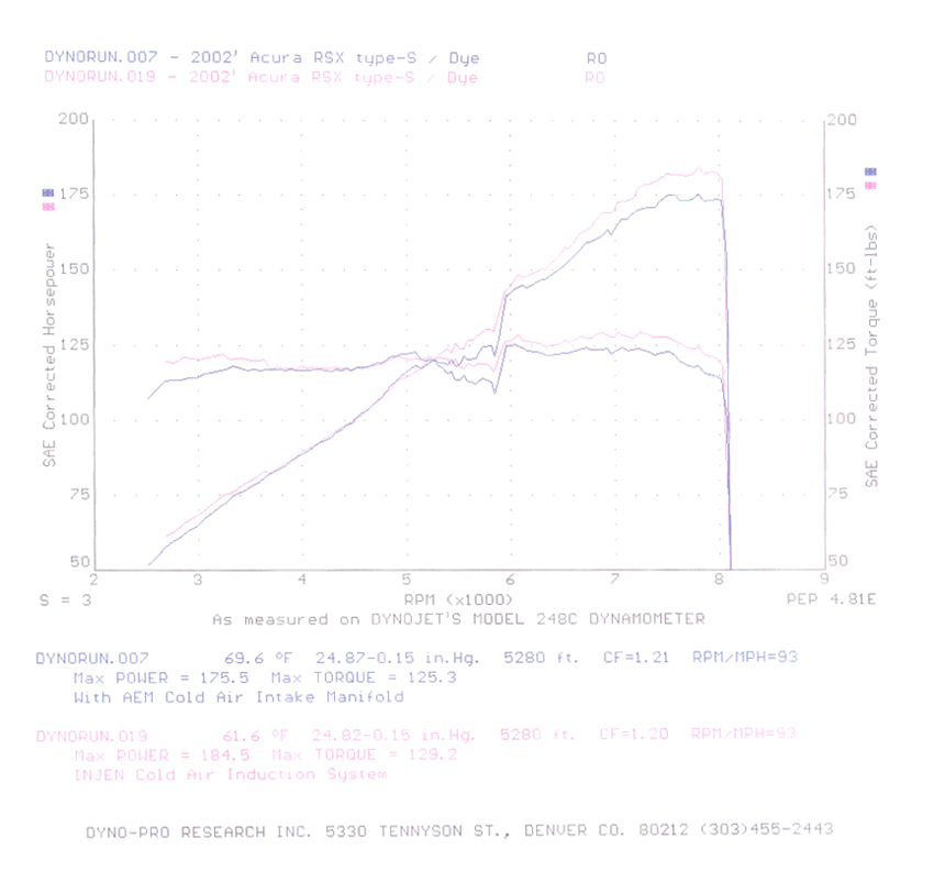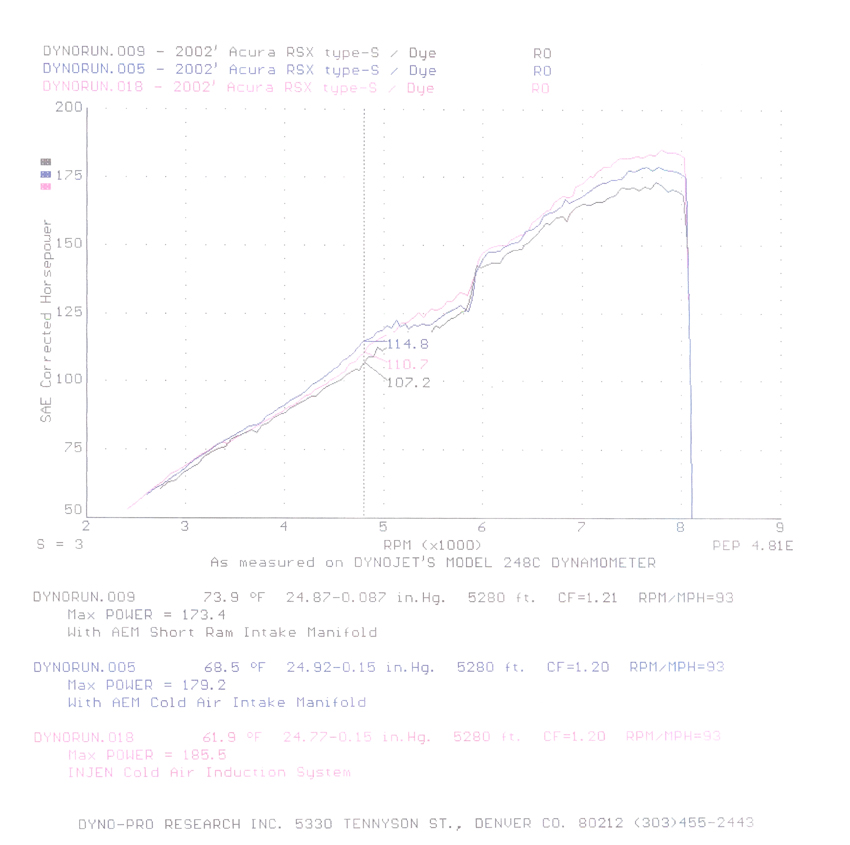 This test was more about testing two new intakes then it was comparing intakes all together like the first two. This time around, the car was much different and had a lot more modifications done to it. This time the car had a Hondata reflash, Jackson race header, and an Injen SES exhaust. This test was to see how sell the AEM V2 did compared to the Injen cold air intake. The tests were once again done on the same DynoJet as the first two tests.
