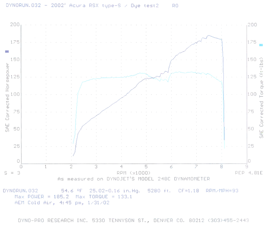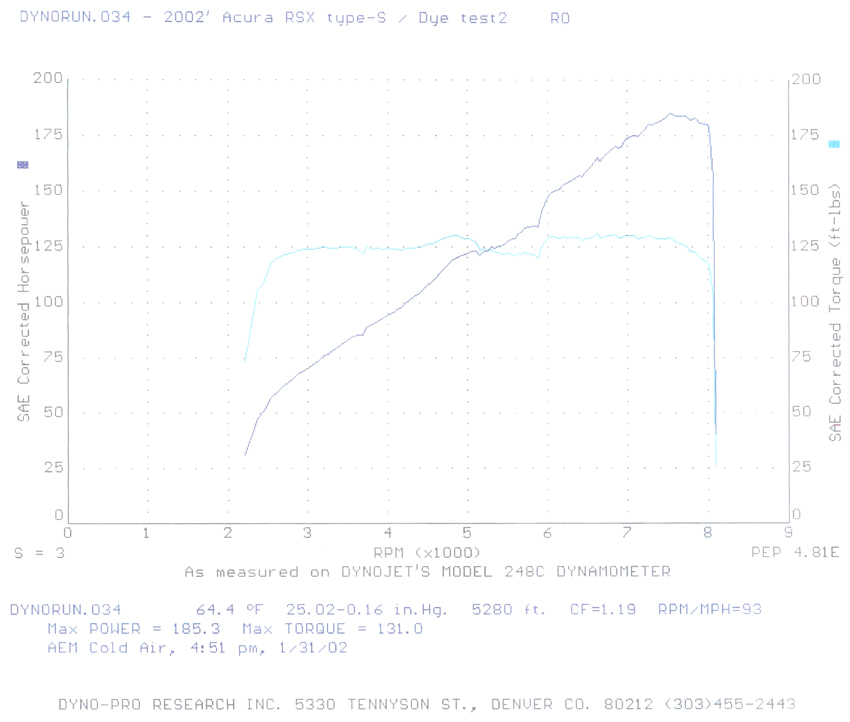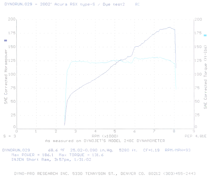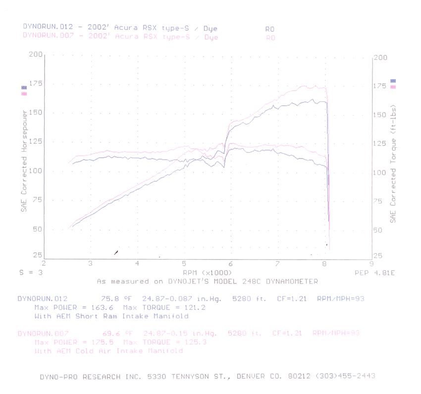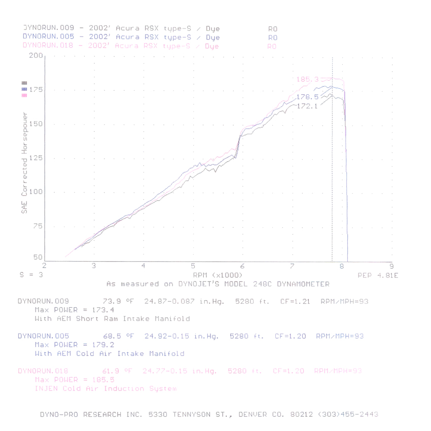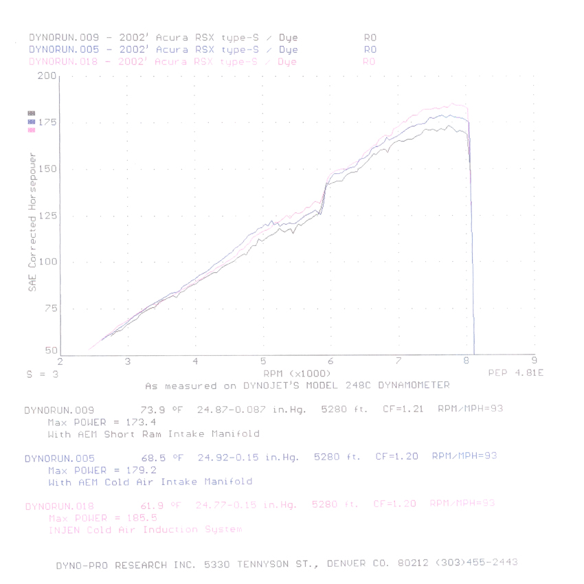 We are starting with this test because it is the most in-depth test and is a much better representation of the performance of each intake. The second intake test was done on January 31st, 2002. We tested all three of the intakes again, the Injen short ram and the AEM cold air & short ram. We used the same AEM cold air and Injen short ram as the first test but we did use a second AEM short ram because of poor results from the first test. Because of certain member opinions from the first test, all of the installs were done by Tobi Connell of TC Performance and no one from Club RSX installed any of the intakes. This was done to ensure the accuracy of each test. There was no change to the car from the first test other then doing an oil change an hour before the test was done. After poor results from the first intake test, we did follow AEM's dyno setup and procedures that they use when they test intakes. This included a fan at the front of the car and at the rear of the car and had a time period of three to five minutes between each dyno pull. These tests were done on the same DynoJet as the first intake test.