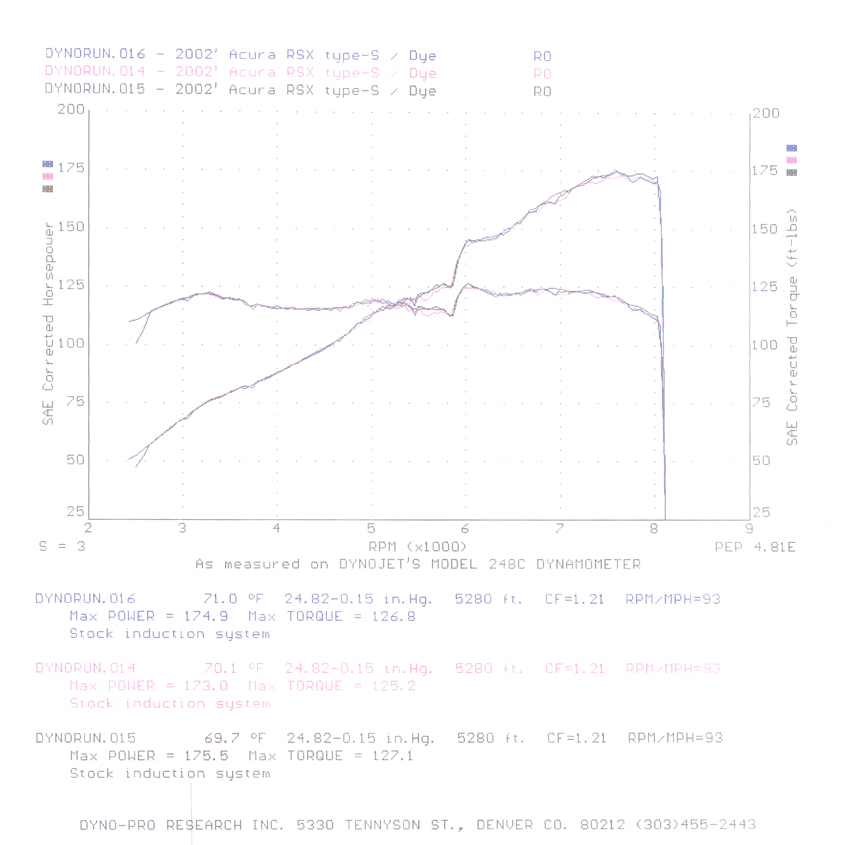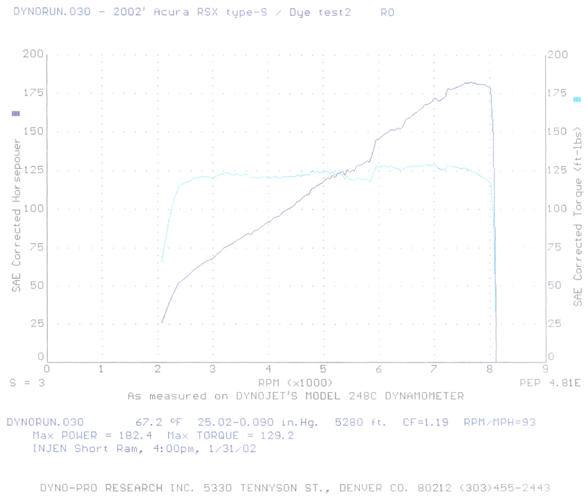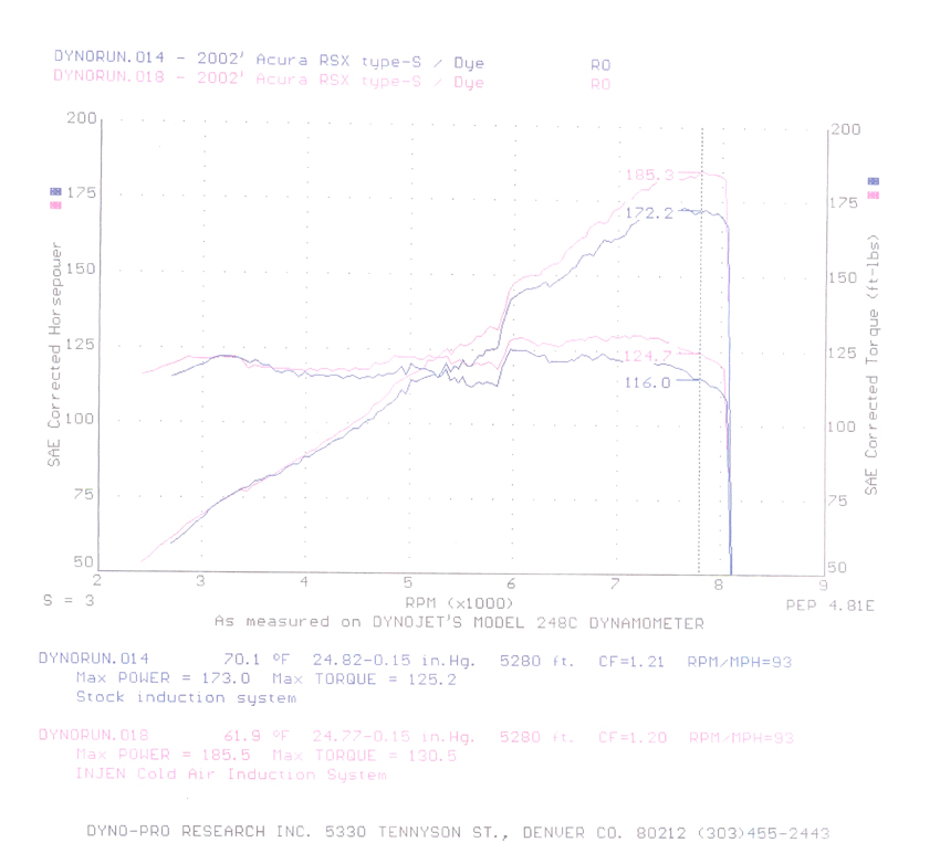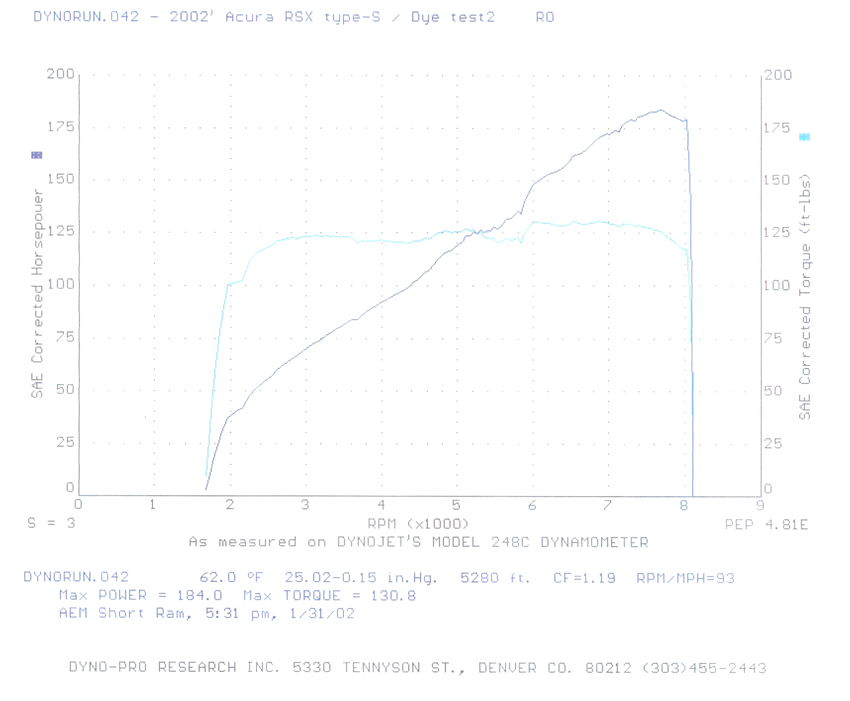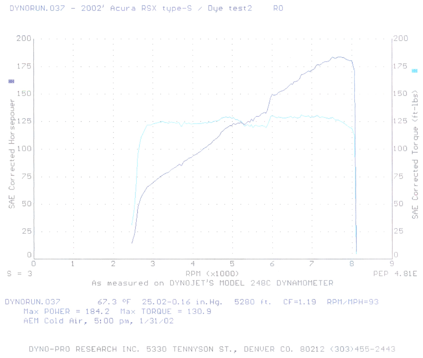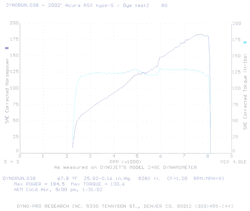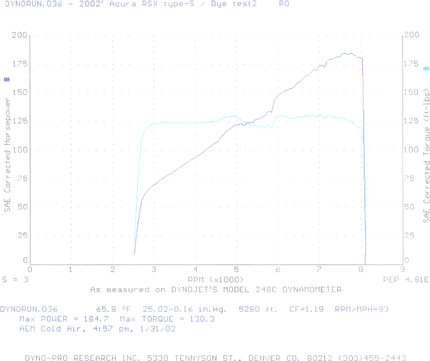 We are starting with this test because it is the most in-depth test and is a much better representation of the performance of each intake. The second intake test was done on January 31st, 2002. We tested all three of the intakes again, the Injen short ram and the AEM cold air & short ram. We used the same AEM cold air and Injen short ram as the first test but we did use a second AEM short ram because of poor results from the first test. Because of certain member opinions from the first test, all of the installs were done by Tobi Connell of TC Performance and no one from Club RSX installed any of the intakes. This was done to ensure the accuracy of each test. There was no change to the car from the first test other then doing an oil change an hour before the test was done. After poor results from the first intake test, we did follow AEM's dyno setup and procedures that they use when they test intakes. This included a fan at the front of the car and at the rear of the car and had a time period of three to five minutes between each dyno pull. These tests were done on the same DynoJet as the first intake test.